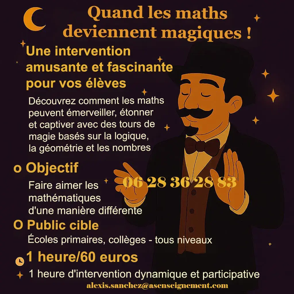 Pendant une heure, je vous propose de découvrir des tours de magie avec vos enfants/élèves. L'objectif est de mobiliser/réinvestir des compétences mathématiques en faisant de la magie. Ces tours sont à destinations d'enfants de 9 à 15 ans.